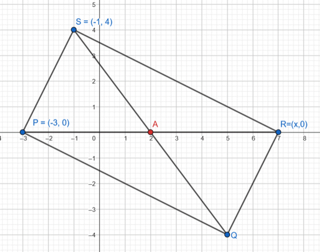 Oblicz punkt przecięcia przekątnych prostokąta PQRS, jeśli P(-3,0) i S(-1,4), a punkt R leży na osi OX.
