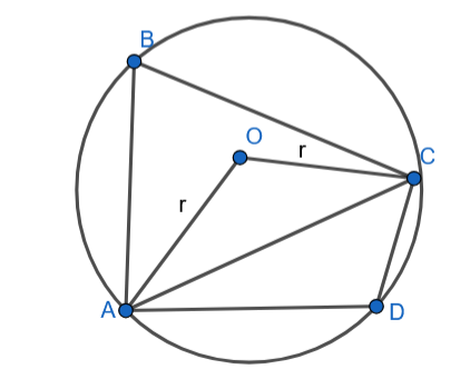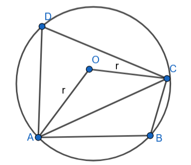 Wyznacz promień tego okręgu, jeżeli wiadomo, że kąt między promieniami AO i CO ma miarę oraz w okrąg o środku O wpisano czworokąt ABCD taki, że i .