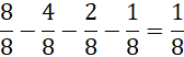 Żeby policzyć jaki ułamek Daglas spotkał na końcu, należy od 1 odjąć wszystkie poprzednie ułamki. Żeby 1 zamienić na ułamek niewłaściwy, zamień 1 poprzez pomnożenie w liczniku wartości tej liczby przez 8. W mianowniku wpisz również 8, żeby dostać wartość równoważną. Pozostałe ułamki doprowadź do mianownika 8, ponieważ można odejmować tylko ułamki o tych samych mianownikach. Odejmując od siebie ułamki zwykłe, odejmij od siebie liczniki, a mianownik w wyniku pozostaw taki jak w liczbach, które odejmowałeś.