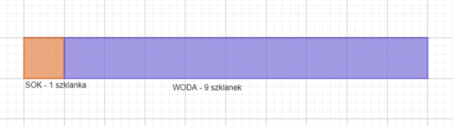 Na rysunku każdy kwadrat oznacza 1 szklankę wody lub soku. Dodaj do siebie ilość szklanek soku oraz ilość szklanek wody – otrzymasz ilość szklanek napoju.