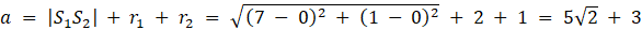Niech a będzie największą szukaną odległością między punktami znajdującymi się na tych okręgach, a d – najmniejszą taką odległością. Odległość a będzie równa sumie odległości między środkami tych okręgów oraz długości promieni obu tych okręgów. Odległość d będzie równa różnicy odległości między środkami okręgów i sumy długości obu okręgów.