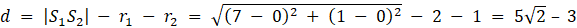 W tym zadaniu musisz wyznaczyć największą i najmniejszą odległość, jakie mogą być między punktami znajdującymi się na dwóch podanych okręgach.