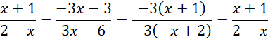 Wyciągając -3 z licznika i mianownika, prawej strony równania dochodzimy do wniosku, że lewa strona jest równa prawej, dla każdej liczby rzeczywistej, oprócz -2, ponieważ ta wartość zostaje wykluczona przez założenia.