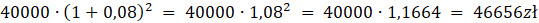 Kredyt zaciągnięty przez pana Tomka na kwotę 40000zł jest oprocentowany na 8% w skali roku. Jego spłatę podzielono na dwie roczne raty o tej samej wysokości. Pierwsza składa się z pewnej części podzielonej kwoty oraz odsetek całej kwoty kredytu należnych bankowi po okresie roku od jego udzielenia. Druga stanowi pozostałą część pożyczonej kwoty oraz rocznej odsetki od tej części.