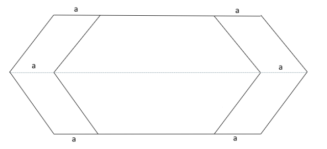 W sześciokącie foremnym wszystkie kąty mierzą 120°. Skonstruuj sześciokąt foremny, a następnie odprowadź przedłużenia podstaw tego sześciokąta, które są równej długości (a) oraz odprowadź przedłużenia środkowej przekątnej tej samej długości. Na końcu, połącz końce tych odcinków.