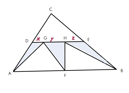 Punkty D, E, F są środkami boków trójkąta ABC. Punkty G, H należą do odcinka DE. W tym zadaniu musisz wykazać, że suma pól trójkątów zielonych jest równa polu jednego białego trójkąta.