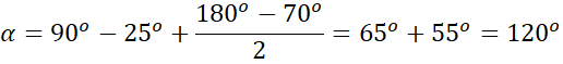 Skorzystaj z tego, że kąt wpisany jest taki sam, jak kąt, który cięciwa okręgu zawierająca ten sam łuk tworzy z prostą styczną. Szukaną miarę kąta oblicz jako sumę kąta przy podstawie w trójkącie równoramiennym i różnicy z kątem prostym.