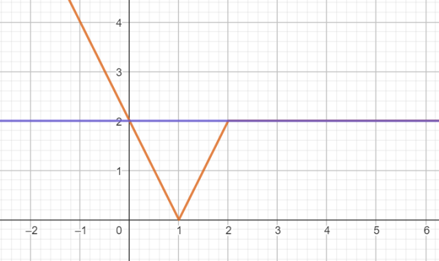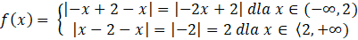 Aby naszkicować wykres funkcji, przekształć jej wzór tak, by opuścić wartość bezwzględną. W tym celu dziedzinę funkcji należy podzielić na przedziały w zależności od znaku wyrażenia pod wewnętrzną wartością bezwzględną. Następnie dla każdego przedziału naszkicuj wykres odpowiadającej mu funkcji. Naszkicuj również wykres stałej funkcji liniowej y = 2. Rozwiązaniami są te argumenty, dla których wykres funkcji f znajduje się nad wykresem funkcji liniowej.