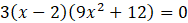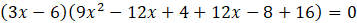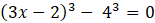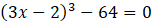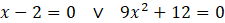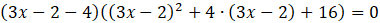 Aby rozwiązać równanie, przekształć najpierw jego lewą stroną do postaci iloczynowej. W tym celu skorzystaj ze wzoru skróconego mnożenia na różnicę sześcianów. Następnie z pierwszego z otrzymanych wyrażeń wyłącz przed nawias czynnik 3, a drugie wyrażenie uprość przez wymnożenie nawiasów i zredukowanie jednomianów podobnych. Iloczyn dwóch liczb jest równy 0 wtedy, gdy co najmniej jedna z tych liczb jest równa 0. x – 2 jest równe 0 dla x = 2, co daje jedno rozwiązanie równania. Wyróżnik wyrażenia 9x2 + 12 jest ujemny, więc czynnik ten nie wyznacza żadnych pierwiastków.