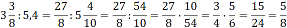 W tym zadaniu zamień ułamek zwykły na ułamek dziesiętny, a następnie dokonaj dzielenia ułamków dziesiętnych. W pierwszej kolejności zamień liczbę mieszaną na ułamek niewłaściwy (tzn. taki, w którym licznik jest większy niż mianownik). Dzielenie ułamków wykonaj, wiedząc, że dzielenie to odwrotność mnożenia tzn. zamień dzielnik (liczba po znaku dzielenia) na jej odwrotność i zamień znak dzielenia na mnożenie. Następnie postępuj tak jak w przypadku mnożenia ułamków. Aby pomnożyć ułamki dokonaj skrócenia ułamków (po skosie, jeżeli to możliwe), a następnie wykonaj mnożenie. W celu wykonania mnożenia, przemnóż przez siebie liczniki oraz mianowniki. Pamiętaj, że kreska ułamkowa zastępuje znak dzielenia. Zapisz ułamek w postaci liczby mieszanej.