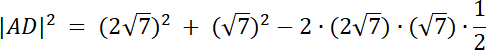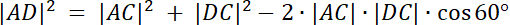 W pierwszym kroku wykorzystaj informację o dwusiecznej i wyznacz wartości kątów: ACD i DCB, a następnie wyznacz długość boku DC, korzystając z równania: PABC = PADC + PDBC. Na koniec, z twierdzenia cosinusów wyznacz długość boku AD.