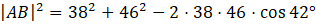 W tym zadaniu musisz obliczyć jaka jest odległość punktu od wierzchołków trójkąta, którego odległość do każdego z wierzchołków trójkąta jest taka sama, jeśli dwa boki tego trójkąta mają długość 38 m oraz 46 m, zaś kąt między nimi wynosi 42°.