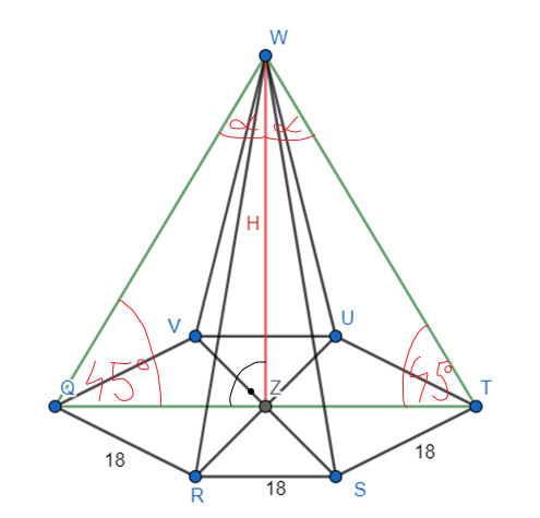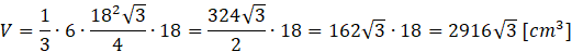 . Zauważ, że trójkąt QZW jest prostokątny i równoramienny, czyli H = 18 cm. Na koniec oblicz objętość ostrosłupa.