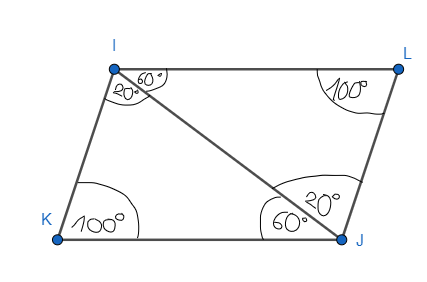 W pewnym czworokącie istnieje oś symetrii, która dzieli go na dwa trójkąty o kątach 20°, 60° i 100°. Znajdź wszystkie możliwe miary kątów tego czworokąta.