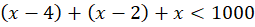 Oznacz jako x największą z tych trzech liczb. Liczby te to x – 4, x – 2 i x (muszą się różnić o 2, skoro wszystkie są nieparzyste i są kolejnymi nieparzystymi liczbami naturalnymi). Zapisz, że ich suma jest mniejsza od 1000. Rozwiąż nierówność. Znajdź największą liczbę całkowitą w zbiorze rozwiązań.