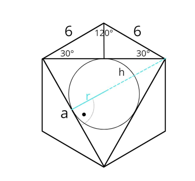 Oblicz promień koła wpisanego w trójkąt BDF wiedząc, że bok sześciokąta foremnego ABCDEF ma długość 6 cm.