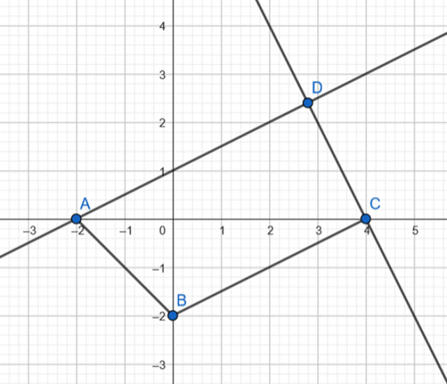 Znajdź współrzędne wierzchołka D, jeśli punkty A(-2,0), B(0,-2) i C(4,0) są wierzchołkami trapezu prostokątnego ABCD o podstawach AD i BC.