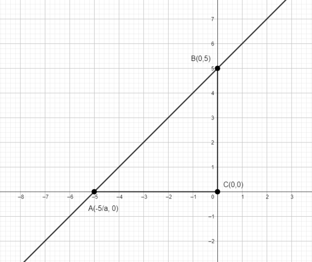 Rozpatrz dwa przypadki: dla – prosta rosnąca oraz dla – prosta malejąca. W obu przypadkach wyznacz współrzędne punktów przecięcia z osiami układu. Oblicz długości potrzebnych odcinków, by wykorzystać wzór na pole trójkąta prostokątnego , gdzie a,b to przyprostokątne. Przyrównaj otrzymany wzór na pole do 25 i oblicz szukane wartości a.