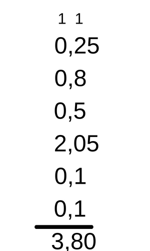 Dodaj wagę torby i wagi przedmiotów znajdujących się w niej do siebie, żeby dostać wagę torby wraz z zawartością. Wykonując dodawanie pisemne, najpierw należy w słupku dodać do siebie cyfry ze słupka znajdującego się najbardziej z prawej. Jeśli otrzymana liczba jest dwucyfrowa, należy cyfrę jedności takiego wyniku zapisać pod słupkiem cyfr jedności, a cyfrę dziesiątek z wyniku trzeba przenieść dalej poprzez dopisanie tej cyfry nad kolejnym w lewo słupkiem. Przy dodawaniu kolejnego słupka, do wyniku należy dodać przeniesioną cyfrę ze słupka wcześniej. W taki sam sposób należy dodawać każdy kolejny słupek, zaczynając od lewej i idąc do prawej. Jeśli w ostatnim słupku wyjdzie liczba większa od 10, to już nie wolno przenosić dalej, bo nie ma kolejnego słupka, lecz należy napisać całą liczbę. Pamiętaj, że przecinek wyniku będzie znajdował się pod przecinkami jego składników.