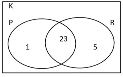 W łatwy sposób możemy określić liczebność poszczególnych zbiorów, wiedząc o tym, że częścią wspólną zbiorów P i R to 23 elementy - czyli osoby, które potrafią pływać oraz jeździć na rowerze. Skoro zbiór oso pływających to 24 osoby, a w części wspólnej znajdują się 23 osoby, to tylko jedna osoba potrafi tylko pływać. Analogicznie ze zbiorem osób jeżdżących na rowerze. Skoro jednocześnie jeżdżą na rowerze i pływają 23 osoby, to tylko 5 osób potrafi tylko jeździć na rowerze.
