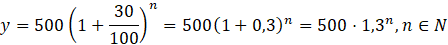 Skoro w ciągu każdej godziny liczba bakterii w kolonii powiększa się o 30%, to liczba bakterii po n godzinach wynosić będzie:
