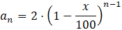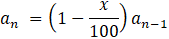 Każdego dnia Marcin jadł o x% czekolady mniej niż dnia poprzedniego. Odpowiada to opisowi ciągu rekurencyjnego o wzorze: