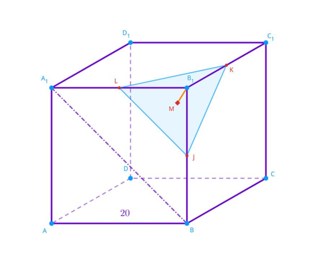 Dany jest sześcian o krawędzi długości 20. Przez bryłę przeprowadzono płaszczyznę w taki sposób, że zawiera ona środki trzech krawędzi wychodzących ze wspólnego wierzchołka. Oblicz dystans między przekrojem bryły a wierzchołkiem, z którego wychodzą krawędzie, których to środki należą do płaszczyzny przekroju.