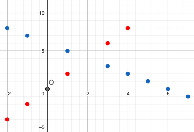 W tym zadaniu musisz obliczyć jaki jest punkt wspólny dla równania niebieskich kropek oraz równania czerwonych kropek.