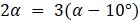 Kąt wpisany jest dwa razy mniejszy od kąta środkowego opartego na tym samym łuku. Kąt opary na 3 razy większym łuku będzie miał 3 razy większą miarę. Przyjmij, że α to miara kąta wpisanego: