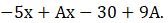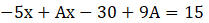 -5x + Ax = 0 oraz -30 + 9A = 15