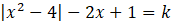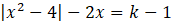 Aby wyznaczyć liczbę rozwiązań równania, przekształć je do postaci, w której po prawej stronie równania jest tylko parametr k. Następnie naszkicuj wykres funkcji odpowiadającej lewej stronie równania (podziel rysunek na dwa etapy, w zależności od znaku wyrażenia pod wartością bezwzględną). Odczytaj, ile rozwiązań ma równanie w zależności od parametru k (aby to zrobić pomóż sobie linijką i przesuwając ją od dołu rysunku równolegle do osi OX sprawdzaj, ile rozwiązań ma równanie dla danej wartości parametru). Następnie zapisz wzór funkcji g(k) oraz narysuj jej wykres.