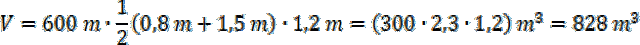 Musisz obliczyć objętość graniastosłupa, którego podstawą jest trapez, a wysokością długość rowu. Zamień podane wymiary na metry: