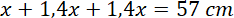 Obwód trójkąta równoramiennego wynosi 57 cm. Jego ramię jest o 40% dłuższe od podstawy. Oznacz długość podstawy jako x, ramię to 1,4x. Podstaw do wzoru na obwód: