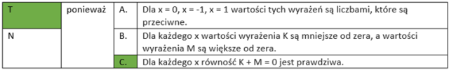 | N | B. | Dla każdego x wartości wyrażenia K są mniejsze od zera, a wartości wyrażenia M są większe od zera. | |