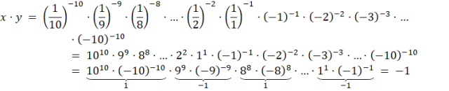 Najpierw uprość zapis liczby x, odwracając ułamki. Następnie przegrupuj iloczyn tak, by połączyć potęgi o przeciwnych podstawach (np. -8 i 8). Ustal znak każdego z takich wyrażeń (- dla nieparzystej potęgi i + dla parzystej) oraz skorzystaj z praw działań na potęgach, by obliczyć wartość iloczynu każdej takiej pary. W ten sposób uzyskałeś(aś) pięć 1 i pięć -1. Zatem wynik to -1.