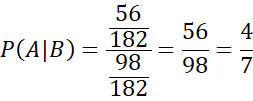 Wypisz wszystkie zdarzenia sprzyjające podanym oraz oblicz ich ilość oraz ilość wszystkich zdarzeń elementarnych. Następnie skorzystaj ze wzoru na prawdopodobieństwo zdarzenia A pod warunkiem, że zaszło zdarzenie B: