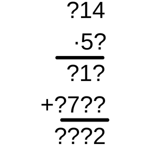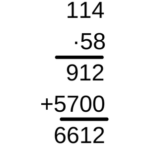 Zauważ, że w wyniku cyfrą jedności jest 2, a nad nią musi być 0, które się dopisuje, więc nad zerem jest 2. Skoro jakaś liczba, będąca cyfrą jedności liczby, przez którą należy wykonać mnożenie, po pomnożeniu przez 4 dała cyfrę jedności 2, to jest to 3 lub 8, ale musi to być 8, żeby przeszło 3 dalej i żeby było 8 · 1 + 3 = 11 przy mnożeniu przez cyfrę dziesiątek większej z liczb. Zostanie wtedy jeden na miejscu dziesiątek w pierwszej liczbie w dodawaniu i 1 przejdzie dalej. Skoro potem występuje mnożenie 5 · 4, to da ono wynik 20 i 0 zostanie zapisane w sekcji dodawania w drugiej liczbie na miejscu dziesiątek, a liczba 2 przejdzie dalej. Ponieważ X14 mnożysz przez 58, a w sekcji dodawania po pomnożeniu 5 · x jest jedna liczba, to musi być to 1, ponieważ 5 pomnożone przez większą liczbę dałoby dwucyfrowy wynik i przeszłaby liczba dalej. Znając, już mnożone cyfry 114 i 58 można dokończyć zadanie, wymnażając cyfrę dziesiątek równą 5 przez kolejne cyfry liczby 114. Należy pamiętać, że po pomnożeniu 4 razy 5 przeszło 2 dalej i na miejscu setek w drugiej liczbie w sekcji dodawania będzie 5 · 1 + 2 = 7. Pięć pomnożone przez następną cyfrę jeden stojącą na miejscu setek da w wyniku 5, które zostanie zapisane na miejscu tysięcy drugiej z liczb w sekcji dodawania. Ostatnią już brakującą cyfrą jest cyfra setek pierwszej liczby z dodawania. Będzie ona równa 8 · 1 i do tego trzeba będzie jeszcze dodać 1, które przeszło wcześniej, co da w sumie 9.