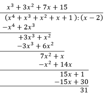 Wykonaj pisemne dzielenie wielomianu przez dwumian i skorzystaj z tego, że jeśli wielomian przy dzieleniu przez dwumian daje wynik i resztę , to można go zapisać w postaci , na tej podstawie zapisz szukaną resztę.