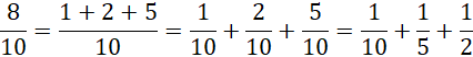 Należy licznik przedstawić w postaci sumy liczb. Pamiętaj, że po przedstawieniu licznika ułamka jako sumy liczb, można zapisać jeden ułamek jako sumę kilku ułamków, takich, że każdy z nich ma w liczniku jeden ze składników, na które rozbito początkowy licznik, a mianownikiem nowych ułamków jest ten sam mianownik co w początkowej liczbie. Następnie należy skrócić otrzymane ułamki, jeśli to możliwe. Skracając ułamki, należy podzielić licznik i mianownik przez największą możliwą liczbę, jaka dzieli obie te liczby bez reszty.