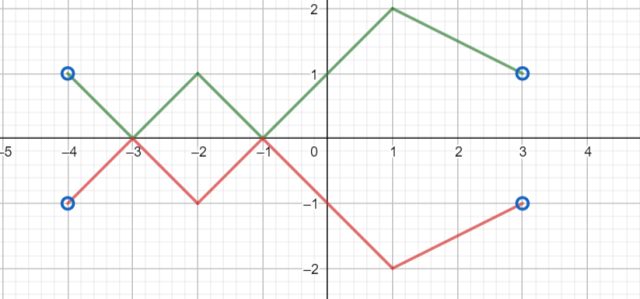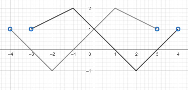 Przekształć wykres przez symetrię osiową względem osi OX – kolor czerwony. (y = -|f(-x)|)
