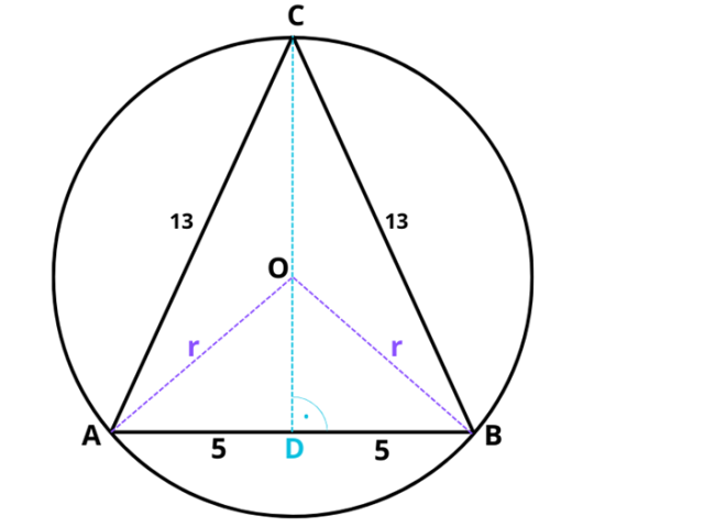 . W tym zadaniu musisz obliczyć promień okręgu opisanego na tym trójkącie o równych ramionach.