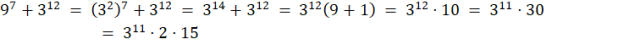 Przedstaw wszystkie składniki sumy jako potęgi liczby 3 i wyciągnij wspólny czynnik przed nawias. Następnie oblicz wartość wyrażenia w nawiasie i wyciągnij brakujące 3 do iloczynu, aby przedstawić daną liczbę jako iloczyn pewnej liczby naturalnej i 15.