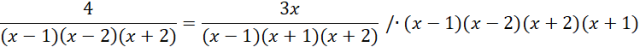 Zapisujemy założenia, a następnie rozwiązujemy je. Przemnażamy przez mianowniki i rozwiązujemy równanie równoważne, następnie porównujemy rozwiązania z założeniami i zapisujemy końcową odpowiedź.