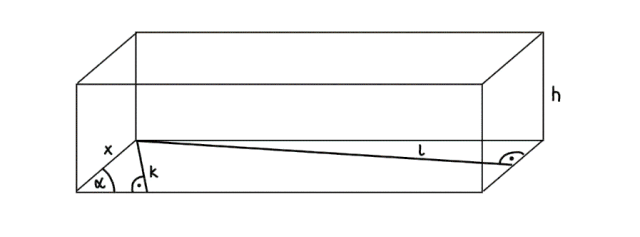 W tym zadaniu musisz obliczyć objętość graniastosłupa prostego o podstawie równoległoboku o kącie ostrym α, jeżeli wiesz, że odległości między równoległymi ścianami bocznymi są równe k i l, a odległość między podstawami graniastosłupa wynosi h.