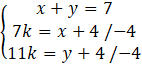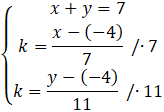 Na początku musisz oznaczyć symbolem przedziałkę osi. Następnie musisz zapisać pierwsze równanie, w którym suma szukanych liczb wynosi 7. Drugim równaniem będzie to, że przedziałka będzie równa różnicy x i -4 podzielonej przez liczbę kresek między nimi powiększoną o 1 (7). W ostatnim równaniu musisz zapisać to, że przedziałka będzie równa różnicy y i -4 podzielonej przez liczbę kresek między nimi powiększoną o 1 (11). Na końcu musisz obliczyć iloczyn szukanych liczb.