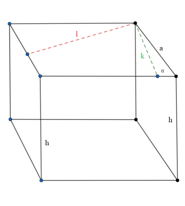W tym zadaniu oblicz objętość graniastosłupa prostego wiedząc, że jego podstawą jest równoległobok o kącie ostrym α. Odległości między równoległymi ścianami bocznymi są równe k i l, a odległość między podstawami graniastosłupa wynosi h.