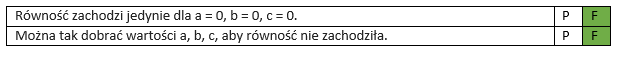 | Można tak dobrać wartości a, b, c, aby równość nie zachodziła. | P | F |