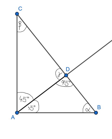 Dwusieczna kąta prostego BAC w trójkącie prostokątnym ABC przecina przeciwprostokątną w punkcie D, gdzie miara kąta ADC wynosi 75°. Oblicz miary pozostałych kątów trójkąta ABC.