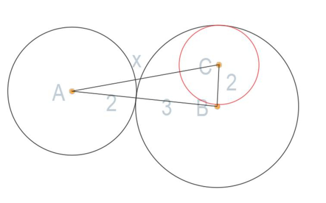 Dane są dwa okręgi styczne zewnętrznie o promieniach 2 i 3 i środkach A i B. Trzeci okrąg o promieniu 1 jest styczny wewnętrznie z dużym okręgiem. Podaj najmniejszy przedział obwodu trójkąta ABC.