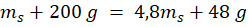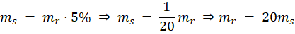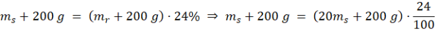 Zapisz w tabeli dane zawierające następujące parametry przed i po dosypaniu soli: masa soli, masa roztworu, stężenie procentowe. W pierwszym kroku wyznacz masę całego roztworu na początku z równania, że masa soli na początku stanowi 5% masy roztworu na początku. Następnie zapisz równanie, że masa soli po dosypaniu soli (o 200 g większa niż na początku) jest równa 24% nowej masy roztworu (o 200 g większej niż na początku). Podstaw do równania wyznaczoną wcześniej masę roztworu i z równania wyznacz masę soli.